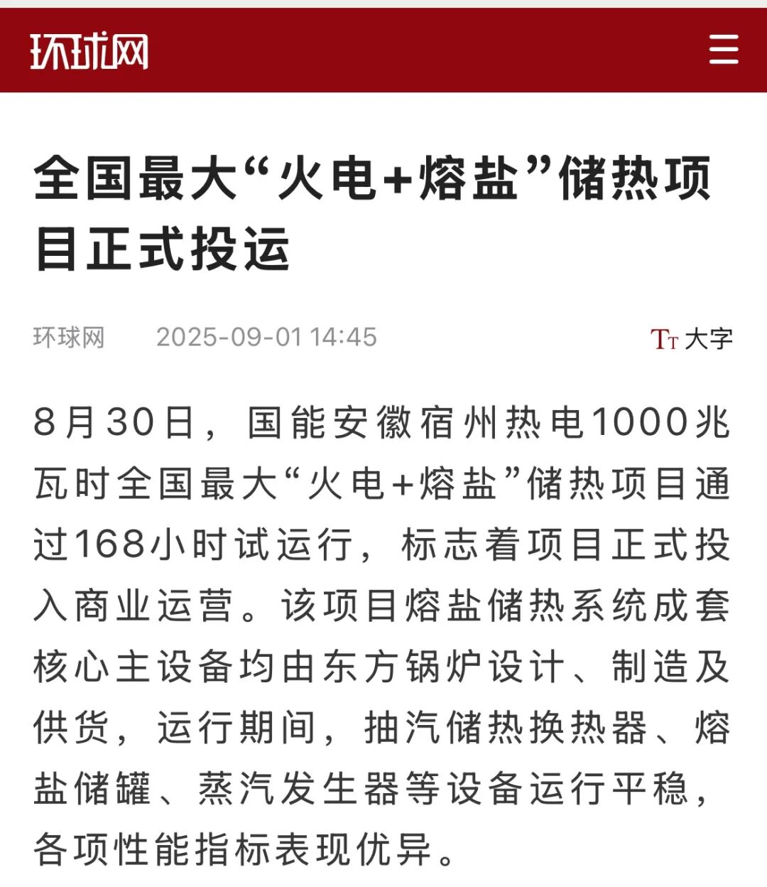 【环球网】全国最大“火电+熔盐”储热项目正式投运