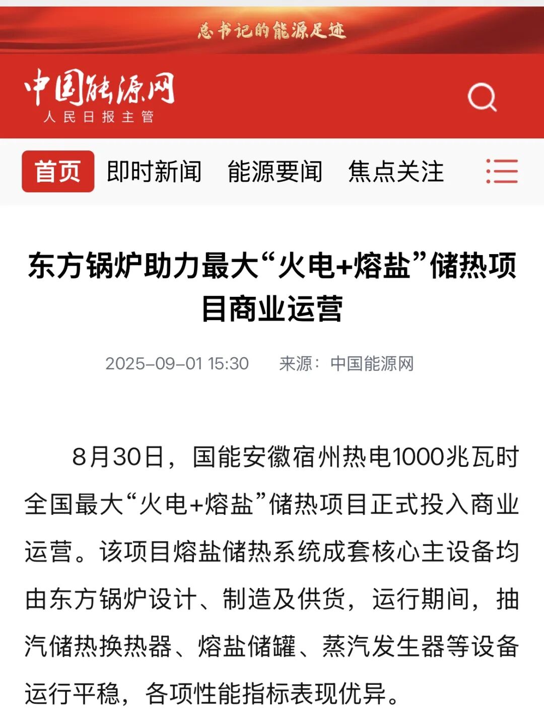 【中国能源网】东方锅炉助力最大“火电+熔盐”储热项目商业运营