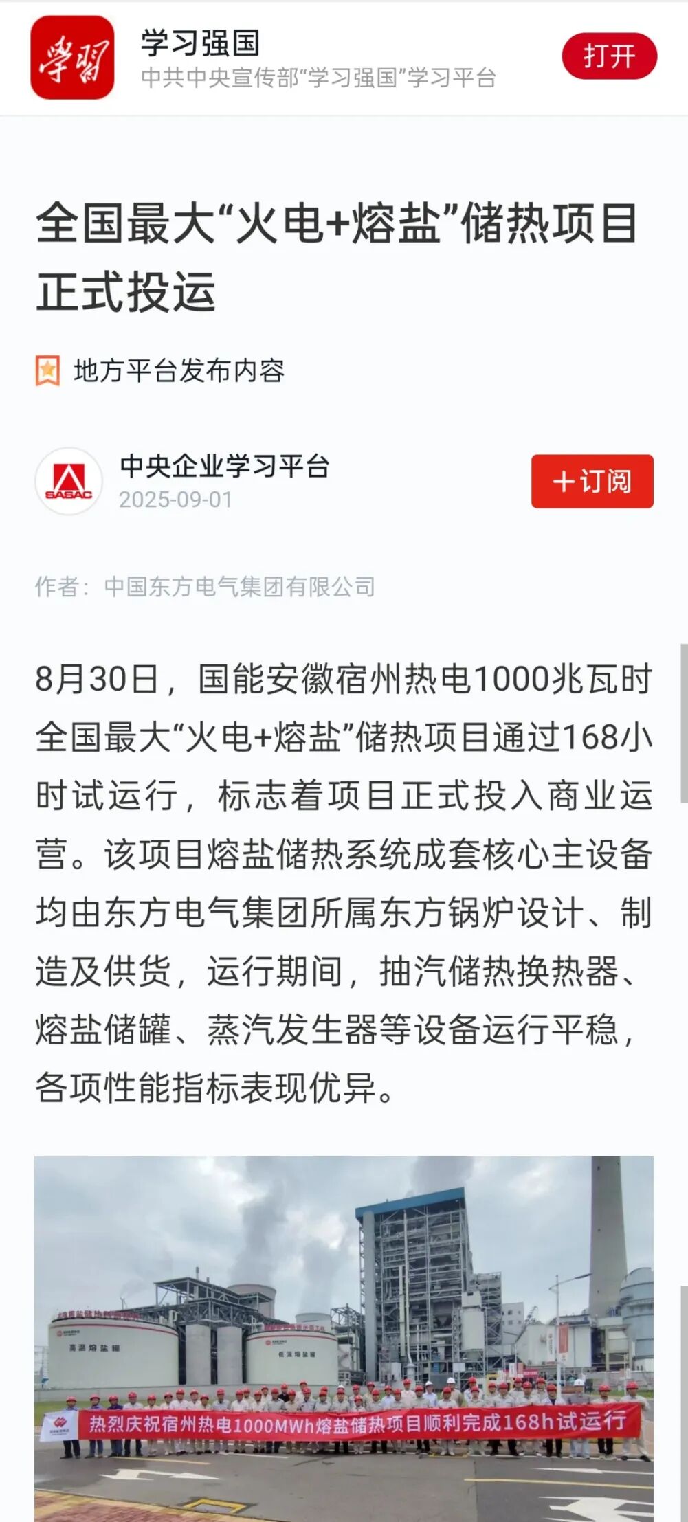 【学习强国】全国最大“火电+熔盐”储热项目正式投运