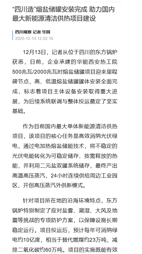 【四川观察】"四川造"熔盐储罐安装完成助力国内最大新能源清洁供热项目建设