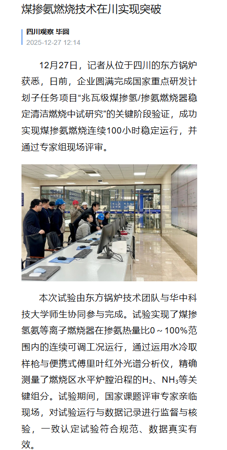 【四川观察】煤掺氨燃烧技术在川实现突破