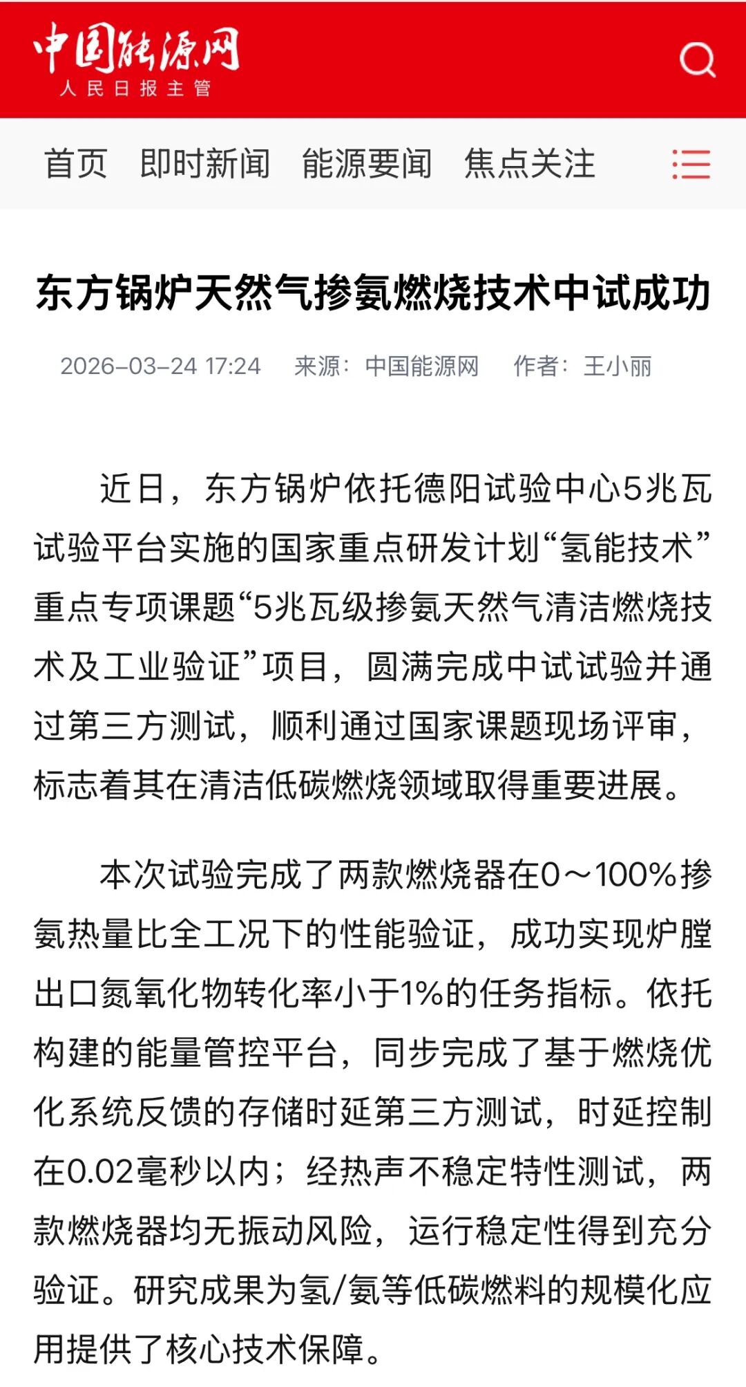 【中国能源网】东方锅炉天然气掺氨燃烧技术中试成功
