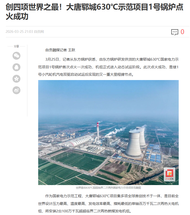 【自贡网】创四项世界之最!大唐郓城630℃示范项目1号锅炉点火成功