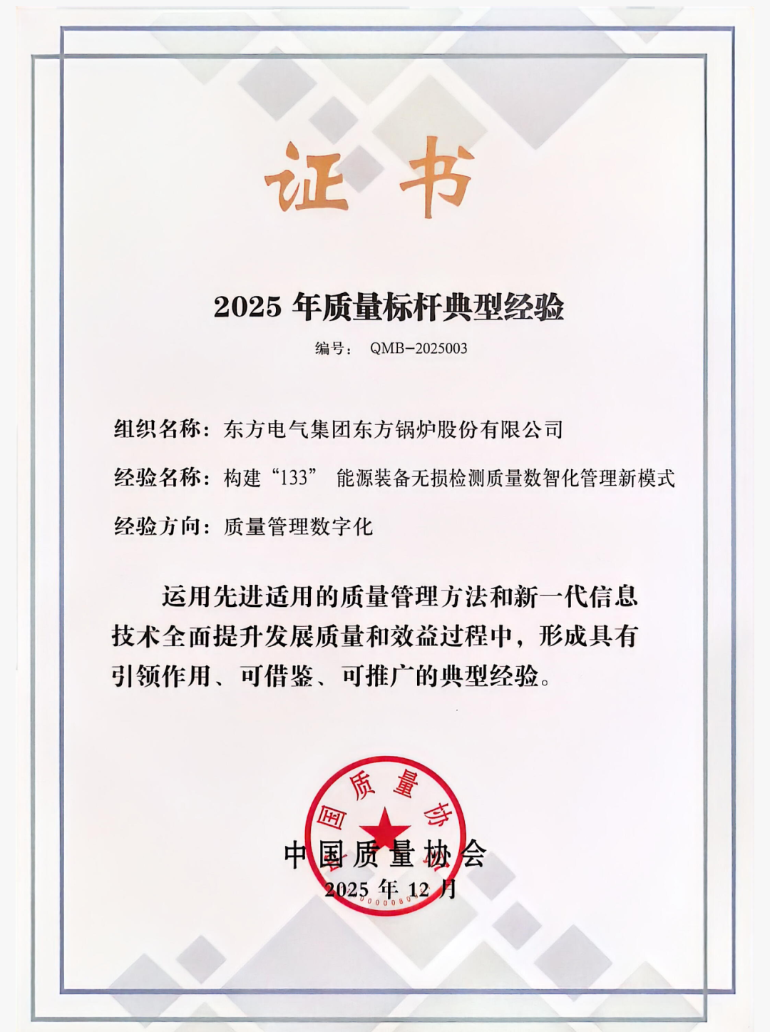 全国质量标杆是由工业和信息化部主导,中国质量协会组织评选的质量领域国家级荣誉,旨在遴选各行业质量管理的先进典范,推动企业迈向产品卓越、品牌卓著、创新领先、治理现代的一流水平。东方锅炉《构建“133”能源装备无损检测数智化质量管理新模式》喜获质量管理数字方向领域“全国质量标杆”,这也是东方锅炉继2024年来连续第二年获得该奖项。该项目立足能源装备安全可靠性要求高、焊接结构复杂、检测难度大等行业特点,全面构建“一个目标、三类路径、三大支撑”的质量管理模式,聚焦“质检方式数字化、质检过程自动化、结果评定智能化”三化突破,使质量控制从“缺陷检测”向“预防风险”、从“经验判断”向“智能决策”系统跃升。
